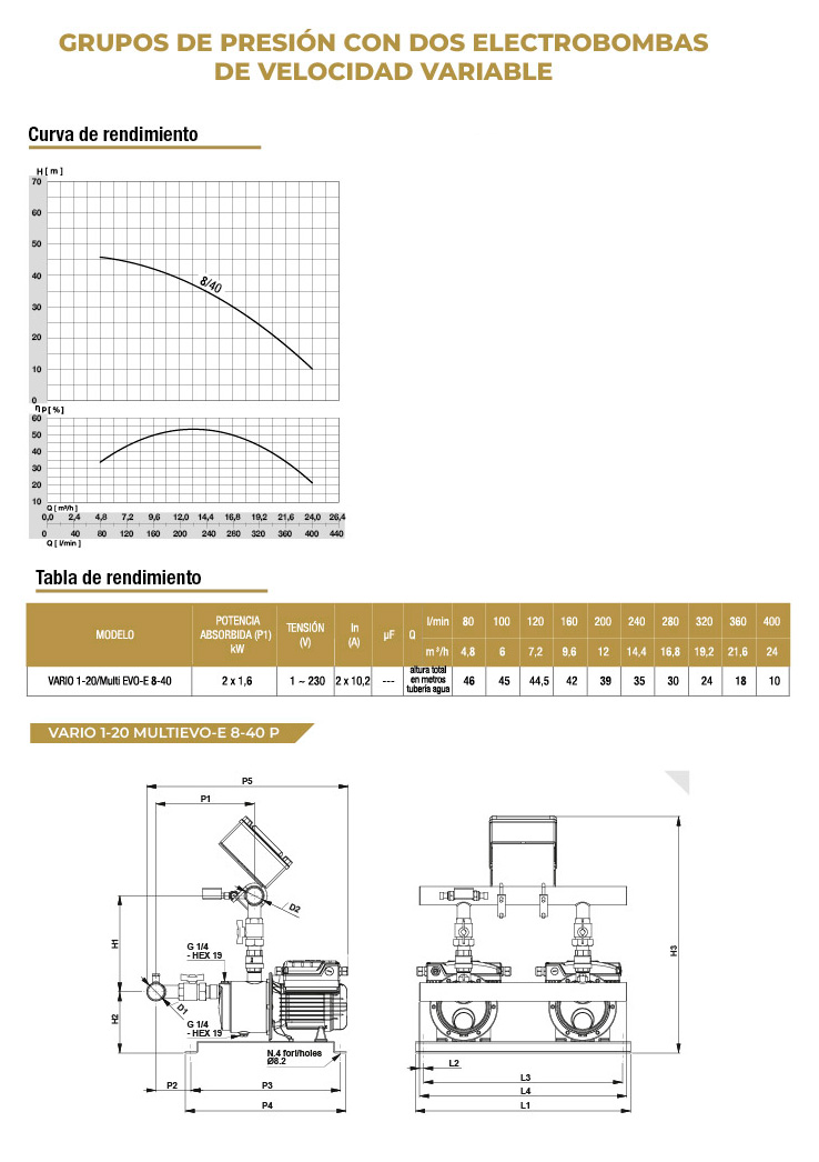 La nueva serie de grupos de presurización con velocidad variable VARIO 1-20 representa una solución fiable y de fácil empleo para aplicaciones residenciales y comerciales. El sistema cuenta con la instalación en paralelo de dos inversores integrados directamente en el motor de cada electrobomba instalada. Los dos variadores de frecuencia comunican y alternan el orden de arranque de cada ciclo de trabajo manteniendo siempre la presión constante en el sistema de distribución.