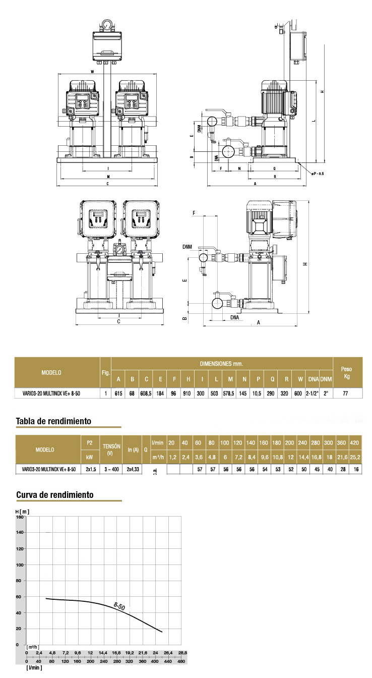 A medida que disminuye la demanda de agua, se producirá una reducción en la velocidad de la última bomba hasta que se apague. El módulo sigue funcionando con la primera bomba hasta que se alcanza la velocidad mínima establecida, si no hay demanda de agua, la bomba se detendrá. El VARIO 3-20 está equipado con cinco modos de funcionamiento para satisfacer diferentes necesidades.
